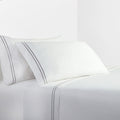 Elevate your bedding ensemble to the luxurious look and feel of grand hotel bedding with our Embroidered Stripe White Sheet Set. Its pure white 350TC cotton sheeting lends an elegant drape and a super-soft yet crisp tactile feel, while a set of elegantly embroidered stripes brings a sophisticated decorative touch.